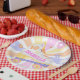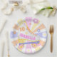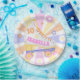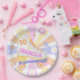 A fun pastel design featuring a white roller skate with space to add a name and age, in the background there is a rainbow burst with daisies. This design features a pink, orange, yellow and purple colour palette. See the whole matching party collection.