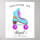 Fun anniversaire signe de bienvenue pour une soirée à thème roller avec une ambiance vintage. Il y a une illustration dessinée à la main d'un patinage à rouleaux de couleurs rose et bleue avec une fausse parties scintillant d'or en forme de foudre imprimé dessus. Le texte dit "Bienvenue". Customisez ce produit en ajoutant le nom et l'âge de votre enfant.