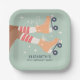 Cute sage green roller skating birthday party paper plates with a retro-inspired illustration of orange roller skates on a dark skin girl wearing red striped tube socks and "Let's Roll" in a fun 70's style script. Add the birthday girl's name in dark teal blue typography.
