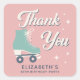 Cute blush pink sticker for her roller skating birthday party featuring "Thank You" in a 70's style script and a retro-inspired illustration of a teal blue roller skate. Personalize with her name in simple dark teal blue typography.