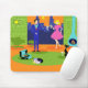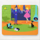 This Retro Romantic Evening Couple Mousepad looks like a scene out of a 1960's romantic comedy. The minimalist design features an attractive cartoon couple in the living room of a mid century modern, urban apartment. The room prominently features a green, stone wall with a floor to ceiling window with a view. Through the window, we can see the blue silhouette of a big city skyline. A crescent moon is just visible in the orange sky of sunset. The furnishings in the room include a green, lounge chair with matching footstool, a yellow, sputnik light fixture, and a turquoise, cone shaped fireplace, complete with roaring fire. In the centre of the orange flooring, there is a round, green shag rug. A portable, turquoise and black record player is placed on the rug. Next to the record player, a vinyl record can be seen poking out of a kitschy album cover. Also on the rug, there is a sleek, black cat wearing a teal collar. This fancy feline is sitting in front of a martini glass. Enjoying this scene, we have a very sophisticated couple. There is a suave man wearing a blue suit, light blue shirt and red tie. The tall, dark and handsome man is enjoying the company of an elegant blonde woman. The lovely lady is wearing a hot pink dress with a form fitting bodice and flared skirt. They are each holding a crystal martini glass with a floating olive. Cheers! Here's to the perfect evening at home!