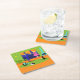 This Retro Romantic Evening Couple Paper Coaster looks like a scene out of a 1960's romantic comedy. The minimalist design features an attractive cartoon couple in the living room of a mid century modern, urban apartment. The room prominently features a green, stone wall with a floor to ceiling window with a view. Through the window, we can see the blue silhouette of a big city skyline. A crescent moon is just visible in the orange sky of sunset. The furnishings in the room include a green, lounge chair with matching footstool, a yellow, sputnik light fixture, and a turquoise, cone shaped fireplace, complete with roaring fire. In the centre of the orange flooring, there is a round, green shag rug. A portable, turquoise and black record player is placed on the rug. Next to the record player, a vinyl record can be seen poking out of a kitschy album cover. Also on the rug, there is a sleek, black cat wearing a teal collar. This fancy feline is sitting in front of a martini glass. Enjoying this scene, we have a very sophisticated couple. There is a suave man wearing a blue suit, light blue shirt and red tie. The tall, dark and handsome man is enjoying the company of an elegant blonde woman. The lovely lady is wearing a hot pink dress with a form fitting bodice and flared skirt. They are each holding a crystal martini glass with a floating olive. Cheers! Here's to the perfect evening at home!