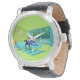 This Retro Romantic Gay Couple eWatch design is simply fabulous! The 1960s style, minimalist art design features an attractive couple enjoying a romantic evening. They are snuggled up on their beautiful, modern turquoise sectional, in their Palm Springs home. The sophisticated, lime green room prominently features a sloped green stone wall, on which kitschy, vintage pebble art is hanging. A fun orange lamp with a two-tier fiberglass shade adorns a side table. The well-dressed men are holding martinis. Through the sliding glass doors, a full moon lights up the night, making mountains, palm trees, and a swimming pool visible. Cheers to the perfect evening!