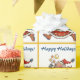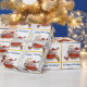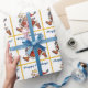 This festive Christmas gift wrap features a cute caricature of Santa Claus in running shoes with yellow stars and moon wands. The image is placed on a white background, and each image is framed in gold with the customizable text in blue "Happy Holidays!" Make it say whatever you'd like. Festive, unique, and colourful!