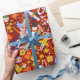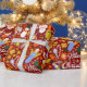 Christmas characters such as Santa Claus, an angel, a nutcracker, snowman and ballet dancer are tucked into flowers, stars, dots and candy to create a fanciful and whimsical holiday print. Merry Christmas is written in a bright white retro font.
