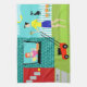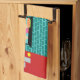 Welcome to Suburbia! This Retro Saturday Morning Kitchen Towel features an attractive minimalist cartoon couple in their little corner of paradise. From the window of a turquoise and teal brick house, we can see Mrs. Homemaker. The beautiful redhead is wearing a hot pink frock. She is holding a pitcher of freshly squeezed lemonade in one hand. On the windowsill in front of her, there is a piping hot, homemade, lattice topped, fruit pie in a green pie plate. On the walkway, in front of the red door to the home, the rolled up Saturday morning newspaper is waiting to be read. Mr. Man of the House is standing on the lush green lawn. He is wearing a blue shorts and a yellow shirt that matches his wife's sunny disposition. He is standing behind a red lawnmower. We can see that he has already mowed a strip of grass, but, at this point, it's difficult to tell if he is working hard or hardly working. The mowing seems to be at a standstill while he enjoys a tangy glass of lemonade. Ah, refreshing! Beside the house, the family feline is perched on a white picket fence. Snowball, the ironically named black cat, is looking down on her loyal subjects and the orange and yellow flowers that border the fence row. The yellow sun is peeking from behind fluffy, light blue clouds. The sky is the shade of aqua reserved for Hometown, USA in kitschy, mid century modern artwork.