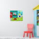 Welcome to Suburbia! This Retro Saturday Morning Poster features an attractive minimalist cartoon couple in their little corner of paradise. From the window of a turquoise and teal brick house, we can see Mrs. Homemaker. The beautiful redhead is wearing a hot pink frock. She is holding a pitcher of freshly squeezed lemonade in one hand. On the windowsill in front of her, there is a piping hot, homemade, lattice topped, fruit pie in a green pie plate. On the walkway, in front of the red door to the home, the rolled up Saturday morning newspaper is waiting to be read. Mr. Man of the House is standing on the lush green lawn. He is wearing a blue shorts and a yellow shirt that matches his wife's sunny disposition. He is standing behind a red lawnmower. We can see that he has already mowed a strip of grass, but, at this point, it's difficult to tell if he is working hard or hardly working. The mowing seems to be at a standstill while he enjoys a tangy glass of lemonade. Ah, refreshing! Beside the house, the family feline is perched on a white picket fence. Snowball, the ironically named black cat, is looking down on her loyal subjects and the orange and yellow flowers that border the fence row. The yellow sun is peeking from behind fluffy, light blue clouds. The sky is the shade of aqua reserved for Hometown, USA in kitschy, mid century modern artwork.