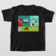 Welcome to Suburbia! This Retro Saturday Morning T-Shirt features an attractive minimalist cartoon couple in their little corner of paradise. From the window of a turquoise and teal brick house, we can see Mrs. Homemaker. The beautiful redhead is wearing a hot pink frock. She is holding a pitcher of freshly squeezed lemonade in one hand. On the windowsill in front of her, there is a piping hot, homemade, lattice topped, fruit pie in a green pie plate. On the walkway, in front of the red door to the home, the rolled up Saturday morning newspaper is waiting to be read. Mr. Man of the House is standing on the lush green lawn. He is wearing a blue shorts and a yellow shirt that matches his wife's sunny disposition. He is standing behind a red lawnmower. We can see that he has already mowed a strip of grass, but, at this point, it's difficult to tell if he is working hard or hardly working. The mowing seems to be at a standstill while he enjoys a tangy glass of lemonade. Ah, refreshing! Beside the house, the family feline is perched on a white picket fence. Snowball, the ironically named black cat, is looking down on her loyal subjects and the orange and yellow flowers that border the fence row. The yellow sun is peeking from behind fluffy, light blue clouds. The sky is the shade of aqua reserved for Hometown, USA in kitschy, mid century modern artwork.