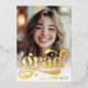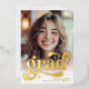 Celebrate the graduate in style with this chic gold foil and white graduation invitation. Featuring a bold retro script on the front and four stylish photo slots on the back, this modern yet timeless design is perfect for announcing your big achievement. Ideal for high school or college graduates, this invite sets the tone for an elegant celebration.