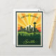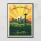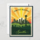 A stylized, vintage-inspired illustration of the Seattle skyline featuring the Space Needle and city buildings against a sunset sky.