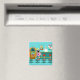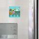 Serve up something special with this Retro Soda Fountain Magnet. The minimalist art, cartoon drawing design features the interior of the coolest spot in town. It's a 1950's soda fountain, in all of its kitschy glory! Against the backdrop of an aqua wall, we can see posters advertising the specialties of the house. One poster shows a hamburger and bottle of pop for the bargain price of 15 cents. The other poster shows two scoops of ice cream in a sugar cone for a mere 5 cents. With prices like these, it must be difficult to watch your waistline! A most competent soda jerk is manning the teal counter with yellow accents. The young man with the strong work ethic is holding an ice cream cone with a single scoop of lemon yellow ice cream--although, to be fair, it could be pineapple! The clean-cut lad is wearing a pristine, white shirt with a black, bow tie and a white hat with red accents. On the opposite side of the counter, we see three red and chrome bar stools. Perched on one of the stools is a blonde teenybopper whose mouth is surely watering. It's unclear if her mouth is watering over the ice cream cone that is headed her way or the industrious young man who is serving it. She is wearing a pink poodle skirt and a form fitting black top. Her yellow locks are pulled back in a classic ponytail. Next to this cutie of a customer there is a colourful, classic jukebox, which features brown, wood grain, panelling and colourful neon lights. Better than that, it is sure to feature all of the greatest rock and roll hits of the time! The floor of this mid century modern ice cream parlour is an aqua and teal, chequerboard pattern that is just screaming for someone to try all of the latest dance moves.