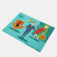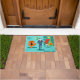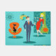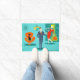 Honey, I'm home! This Retro Space Age Cartoon Couple Door Mat will have you feeling envious of the cartoon couple on a throw pillow! The design features a turquoise background with teal bricks and an olive green, cone fireplace. A sleek, black cat is sitting on a sleek orange chair. There is a teal, starburst wall clock and a two-tier pendant lamp in shades of yellow, blue and black. Front and centre, there is a distinguished, martini-swilling businessman in a blue suit and orange tie. To his side, his blonde bombshell of a trophy wife is wearing a red wiggle dress and holding a tray of martinis. Va-va-va-voom!