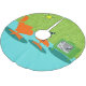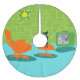It is said that dogs have owners and cats have staff. The feline on this Retro Space Age Kitty Christmas Tree Skirt couldn't agree more! The 1960's style, minimalist art design features a sleek, black cat in a mid century modern living room. The sophisticated room prominently features a green, stone wall. The carpet is aqua with teal shadows. The furnishings of the room include a yellow, sputnik light figure, an orange lounge chair with matching footstool and a green television with rabbit ears. The lucky black cat can be seen perched on the footstool in front of the television. Its favourite show is on! On the television screen, we can see a black and white, classic television family solving all of life's problems in a half hour show. This design is purrrfect, if we do say so ourselves.