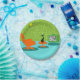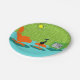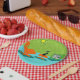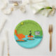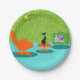 It is said that dogs have owners and cats have staff. The feline on this Retro Space Age Kitty Paper Plate couldn't agree more! The 1960's style, minimalist art design features a sleek, black cat in a mid century modern living room. The sophisticated room prominently features a green, stone wall. The carpet is aqua with teal shadows. The furnishings of the room include a yellow, sputnik light figure, an orange lounge chair with matching footstool and a green television with rabbit ears. The lucky black cat can be seen perched on the footstool in front of the television. Its favourite show is on! On the television screen, we can see a black and white, classic television family solving all of life's problems in a half hour show. This design is purrrfect, if we do say so ourselves.