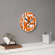 This clock is covered with mid-century modern squares of orange and black starbursts. Fun for any room.