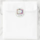 A sticker featuring a light green background with small light green polka dots. Retro inspired pink TV set features a test screen and rabbit ear antennas. Text on TV reads "Stay Tuned For An Important Message From." Personalize with your name under white section below TV set. Look for matching items at Jill's Paperie.