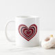 A stylish ceramic mug featuring a bold retro striped heart design in red set against a white background. This minimalist yet expressive design adds a warm, artistic touch to your daily coffee or tea ritual.