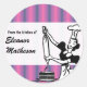 A vintage illustration of a baker against a purple tonal striped background form the visual base for this cute sticker. Use the "From the Kitchen of" expression or make it your own and add your own (or someone else's) name. Write in your dish name below. Available in alternate designs and colour combinations.