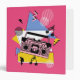 Colourful retro style boombox design with geometric shapes, triangles, rectangles and striped rounded shapes