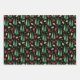 These gift wrapping paper sheets feature a Christmas pattern with a retro style look consisting of Christmas trees, gifts and gold swirls in muted greens, dark red and gold. This set offers the background is black, white and dark red.