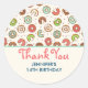 Birthday thank you sticker with a cute pattern featuring doughnuts tumbling all around. Pink, green, brown and cream colours really give this design a cool retro feel.