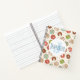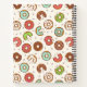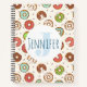 Personalized notebook with a cute pattern featuring doughnuts tumbling all around. Pink, green, brown and cream colours really give this design a cool retro feel. A circle layered over top with your name and monogram initial inside.