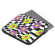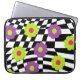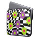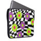 Protect your laptop in style with this colourful case with art by Buttercup's Clothing and Collectables. Cool case features a cool mod style pattern of purple , lime green , and hot pink flowers against a crooked black and white chequered background. Available in various sizes.