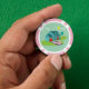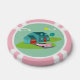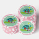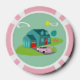 This Retro Suburban House Poker Chip pattern features a typical American home in a typical American neighbourhood, circa 1950. A teal home with a peacock blue roof, and turquoise windows are perfectly offset by a vibrant red front door and garage door. A classic pink, 1950’s finned convertible car is parked on the picturesque driveway. Kitschy, plastic, pink flamingos look right at home on the boomerang shape of freshly mowed green grass resting on a jade background. The manicured lawn is landscaped with whimsical trees. Kidney bean shaped clouds and a yellow sunburst of a sun let you know it’s just another glorious day in mid century modern suburbia.