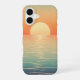 Minimalist illustration of the sun illuminating calm waves in a warm vintage style.