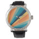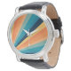 Retro style sun rays geometric pattern illustration with yellow, orange, blue and turquoise stripes decoration