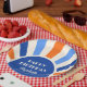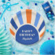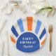 Blue, orange and cream retro sunshine arch frame typography birthday paper plates.