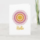 This design features a colourful Retro Sunburst in orange, purple and gold with a matching whimsical font that says: Hello. This folded note card is ideal for saying hello to friends and family or to send a short note to stay in touch. It's available as a standard 5 inch x 7 inch card or in a smaller 4 inch x 5.6 inch size and can be applied to either horizontal or vertical orientations. This design can be scaled smaller for additional customization and personalization. The inside of this card is left blank, so there's plenty of room to write a detailed note, or to customize it further to your needs. Sunbursts are an iconic design motif that conveys positive energy and a feeling of renewal. This sunburst design is also available in additional colour variations and additional products, please visit our store to see additional details. Optional white envelopes are also available.