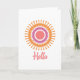 This design features a colourful Retro Sunburst in orange and violet with a matching whimsical font that says: Hello. This folded note card is ideal for saying hello to friends and family or to send a short note to stay in touch. It's available as a standard 5 inch x 7 inch card or in a smaller 4 inch x 5.6 inch size and can be applied to either horizontal or vertical orientations. This design can be scaled smaller for additional customization and personalization. The inside of this card is left blank, so there's plenty of room to write a detailed note, or to customize it further to your needs. Sunbursts are an iconic design motif that conveys positive energy and a feeling of renewal. This sunburst design is also available in additional colour variations and additional products, please visit our store to see additional details. Optional white envelopes are also available.