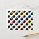 This postcard is embellished with a lively pattern made up of retro 1970’s design inspired sunglasses in primary colours of red, blue and yellow with black accents.