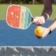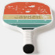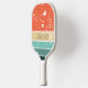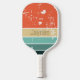 Retro sunset pickleball paddle with an orange, yellow, green, black, and white background. Double-sided and personalized with a name on one side with a cool distressed font.