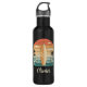 This personalized water bottle features featuring a cool surfboard, rolling retro-style waves, and minimalist palm tree silhouettes. This design blends bold vintage hues for a nostalgic surf aesthetic.