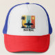 Bring retro waves to your look with the "Beach Rider" hat! 🧢🌞 Features a bold silhouette of a surfer and board walking in front of vertical retro panels (yellow, blue, red), with faded palm trees and tropical leaves in the background. Vintage-style distressing completes the cool beach aesthetic — perfect for sunny days and surf lovers! 🌴🔥