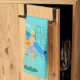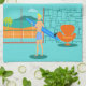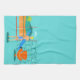 Every day can be a day at the beach with this Retro Surfer Dude Kitchen Towel. The 1960's style, minimalist art design features a sun-kissed, blonde, surfer dude all ready to catch a wave. Our fit surfer is gazing out on the ocean through the sliding glass doors of his beachfront home. He is standing in his aqua coloured living room. We can see an aqua and turquoise, stone wall and mid century modern, orange chair. On the opposite side of the glass door, we can see a patio. Beyond that, there is a golden, sandy beach, swaying palm tree, sparkling, peacock blue ocean, and an aqua sky. In the distance, we can see a teal volcanic island, which is dormant for the time being. Surfer Dude is holding a blue surfboard and wearing blue, tiki patterned board shorts. Catch some waves and share some love with this kitschy summer design!