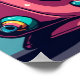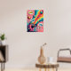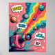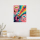 This poster transports you to a world where nostalgia meets the surreal, centred on a classic retro Polaroid camera that acts as a dream machine. Instead of capturing memories, it ejects a whimsical "cosmic parade" of vibrant planets, moons, and candy-striped celestial bodies. This artwork is a masterful fusion of styles, blending the bold, ultra-saturated colours and crisp linework of Pop Art with a surrealist concept that challenges reality. The entire scene is anchored in a 1960s mod-era aesthetic, with a background of exploding colour blocks and playful starbursts that give it a distinctive vintage flair. The result is a visually captivating piece that is perfect for adding a touch of quirky, creative energy to any space.