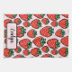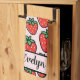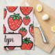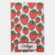 This personalized, vibrant strawberry kitchen towel features oversized, juicy red strawberries with crisp black outlines and bright green leaves, popping against a soft, pastel pink background.