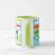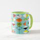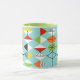 Cette rétro tasse de sonnerie de motif de harlequin est style moderne de la moitié du siècle à son plus fin. Les caractéristiques de conception inspirées vintages qu'un arrière - plan d'aqua avec des rangées des formes triangulaires formant un harlequin modèlent. Les formes deux-modifiées la tonalité de diamant sont jaunes, blanches, rouges, oranges, noires, vertes, et blanc avec des accents noirs. Mais l'attente, là est plus ! Il y a également des ovales oranges, des ovales verts avec les starbursts noirs, et des contours des diamants noirs. Le temps marche dessus, mais vous vous sentirez comme vous avez trouvé un souffle kitschy du passé avec ce trésor géométrique coloré.