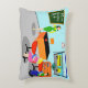 This customizable Retro Teacher Accent Pillow gets an A+! This 1960's style, minimalist art, cartoon drawing features a vibrant, elementary classroom with everything needed to mould the minds of the future. It's the sort of room where ideas are valued and creativity is praised. At the front of the mid century modern classroom, we see the school's most popular teacher standing in front of a chalkboard. Teacher is wearing a bright green and yellow dress, with yellow shoes. Even though the clock on the blue wall tells us it is almost time for the final bell to ring, she still looks as fresh as a daisy. Her black hair is kept in place with a yellow headband and her mod, red glasses help her see to curtail any mischief on the back row. She is resting one hand on her orange and black desk. The clean desk is a tribute to her fine organizational skills. The only thing on the desktop is a shiny, red apple, which was undoubtedly given to her by an adoring student. Speaking of students... We can see a couple of those, as well. From our vantage point, we can see two eager students sitting behind their red, school desks. There is a blonde girl with a bouncy ponytail wearing a bright pink dress. Next to her, there is a dark haired lad wearing a green shirt and blue jeans. Each child is holding a bright blue school book. They are so eager to learn that they haven't even noticed it is almost time for them to board the yellow school bus we see waiting for them through the open blinds on the classroom window. Beneath the window, there is an orange bookshelf holding colourful books and a globe of the world. Don't worry, kids. Tomorrow, you will be back in your places with bright, shining faces. The name on the chalkboard is customizable.