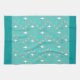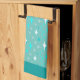 A kitchen towel with a retro star pattern in teal and white on a light teal background and dark teal borders.