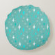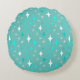 A round throw pillow with a retro atomic star pattern in teal and white on a light teal background.