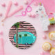 Pink and black striped background with palm tree and turquoise teardrop camper