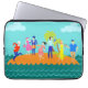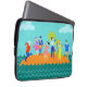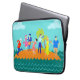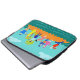 Mayday! Mayday! This Retro Three Hour Tour Laptop Sleeve features a 1960's style, minimalist cartoon drawing of seven stranded castaways on a formerly deserted tropical island. The kitschy, mid century modern design shows teal waves lapping against the orange, island sand. Against the backdrop of a turquoise sky, we can see the passengers and crew of a doomed sightseeing expedition. Hmm... Let's see, who we have here. There's a lanky, young man wearing blue, bell-bottom pants, a red shirt with white collar, and a white bucket hat. On the opposite side of the island, the brave and sure skipper is wearing khaki pants, a blue shirt, and a blue, captain's hat. In one hand, this sizable sailor is holding a portable radio, which is their last link to civilization. Next to the free-spirited first mate, we see a wealthy couple. They appear to be a millionaire and his wife. The man is wearing a hand-tailored, blue suit, red tie, and blue fedora hat. In one hand he is holding an orange suitcase, which seems to be stuffed with cash. His other arm is draped around the waist of his lovely wife. She looks the part of a high-society matron in her hot pink dress with matching hat and handbag. Money is casually escaping her designer purse. On one hand, she is wearing a 40-carat diamond ring, which is roughly the size of a doorknob. A ginger-haired starlet is also among those on the island. This glamourous movie star is wearing a slinky, yellow, evening dress with a slit cut up to there. And then there are the rest of the castaways... Oh, what the heck! We'll go ahead and describe them. There is a good looking scholarly gentleman wearing blue pants and a lighter blue shirt. He is deep in thought as he reads the textbook in his hand. Let's hope he's reading up on how to build a boat to get them off of the island! We also see a fresh faced, farm girl from Kansas. This petite cutie is wearing a red, gingham dress that is just right for pie baking. Oh, look! She's holding a pie. No one will go hungry on this island. In the background, we see two swaying palm trees that will be the ideal place for hanging a hammock. This is the perfect design for every fan of classic television and pop culture.