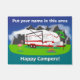This doormat can be customized to show your name on top. When used outside of your travel trailer, people will know who they are talking to when they see you. Non-slip rubber that won't crack or buckle, this mat resists fading, mould, and mildew and can be easily cleaned with a hose. This version has a red trailer with dual axle.
