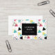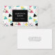 Retro business card featuring a pattern of triangles in different colours: pink, black, turquoise, and yellow. Some triangles are solid, others feature only their outline. Add your name in modern letters on a black label, and your contact info to the back of the geometric business card.