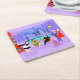 This Retro Tropical Christmas Party Paper Coaster is festive enough to brighten anyone's holiday outlook! The cartoon design features the type of wildly sophisticated holiday party that is normally only seen in Christmas movies from the 1960s. There is a mid century modern living room filled with partygoers enjoying the swanky, purple decor. A lovely woman in a French maid's uniform is carrying a tray of martinis. She is standing beside a red, cone fireplace with a roaring fire. Three green stockings are hung by the mod chimney with care. In the centre of the room, an attractive couple is lounging in orange egg chairs. The woman is wearing a festive, green dress. The man is wearing a black suit with a red tie. They are each holding a martini. Another couple is getting cozy beneath a dangling, yellow, Sputnik chandelier. The distinguished, grey haired gentleman is wearing a blue suit, light blue shirt and red tie. He is also wearing a Santa hat and holding a martini in each hand, showing the world that his partying days are far from over. His companion is a shapely blonde in a stunning red dress. Mr. Distinguished had better look out because she is holding a sprig of mistletoe in her hand. At the front of the room, there is a kitschy, pink Christmas tree, complete with teal ornaments and a yellow star. Behind this scene, we can see through floor to ceiling glass walls. The outdoor scene features a round, turquoise swimming pool. We can see the purple silhouette of a woman dipping her legs into the water. Between purple, stone walls, there are silhouettes of palm trees decorated with ornaments and Christmas lights. The silhouettes of dancing and talking partygoers are also visible. If there's one thing this proves, it's that, while people who live in glass houses shouldn't throw stones, they should definitely throw parties!