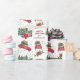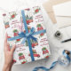 This festive Holiday gift wrap features images of retro red cars and trucks carrying freshly cut Christmas trees and brightly wrapped gift packages. A poinsettia bouquet and a spray of gold stars add extra sparkle to the design. Your custom text is in red between the images. Fun for all ages, with a touch of nostalgia.